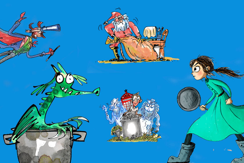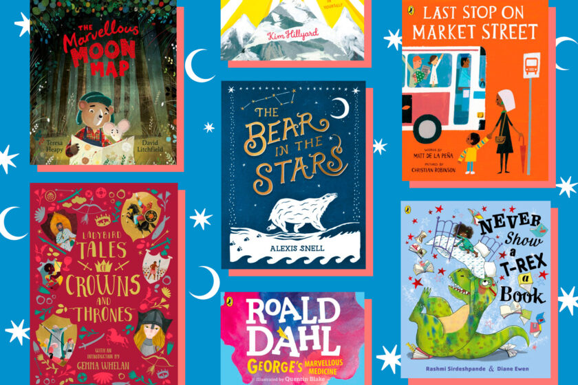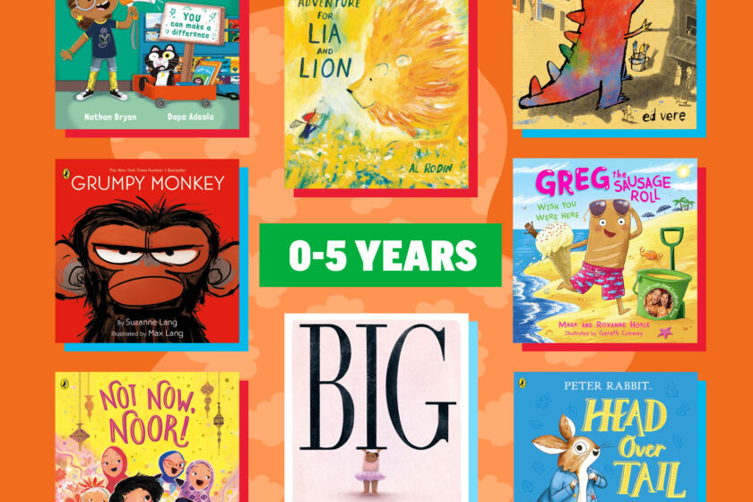 A picture of several different children's books on a pink to blue ombre background; each book has a bright yellow shadow